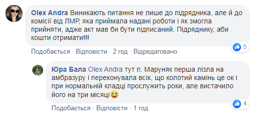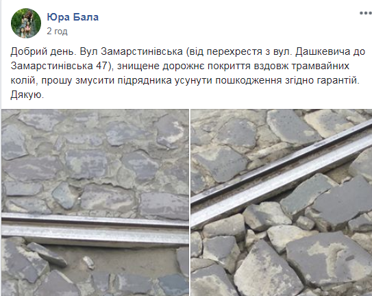 Як пише “Четверта студія”, на “Гарячій лінії міста Львова” у ФБ оприлюднено звернення Юрія Бала в якому він закликає міську владу “змусити підрядника усунути пошкодження згідно гарантій”.