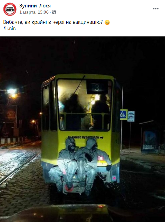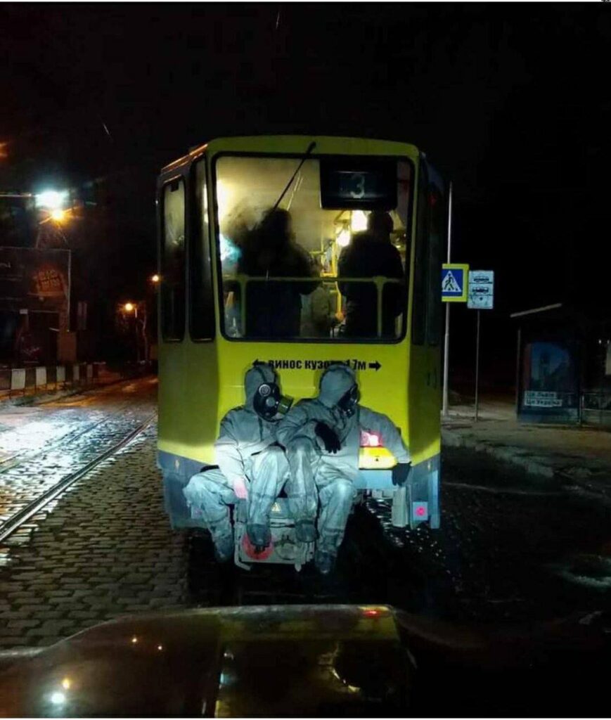 У соцмережах оприлюднили світлини, як двоє людей у костюмах спецзахисту їдуть на задньому зчепі трамвая.