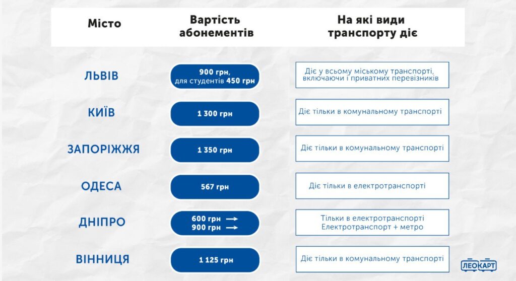 А скільки коштують безлімітні абонементи в інших містах і в якому транспорті діють – дивіться у порівнянні.