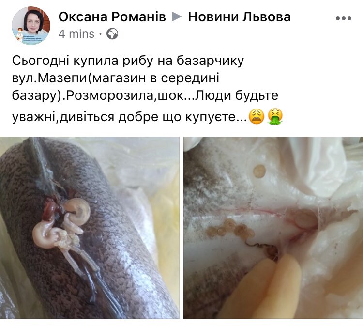 “Сьогодні купила рибу на базарчику вул. Мазепи (магазин всередині базару). Розморозила, шок. Люди будьте уважні, дивіться, що купуєте”, – йдеться у дописі.