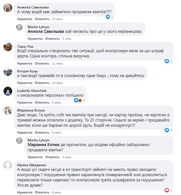 «Трамвай номер 6 , 8:35. Водій не хотіла продавати мені талон, аргументуючи, що вона не буде приймати гроші, і не буде перевіряти дійсні вони чи ні. Хай цим займається банк. Я їй пояснювала, що лише кошти номіналом до 2003 року вийшли з обігу. Я була змушена вийти з транспорту, щоб не отримувати штраф, якщо зайдуть контролери. Вже не в котре бачу хамське ставлення водіїв електротранспорту, можливо потрібно оновлювати персонал?», – зазначається зверненні на «Гарячу лінію міста Львова».