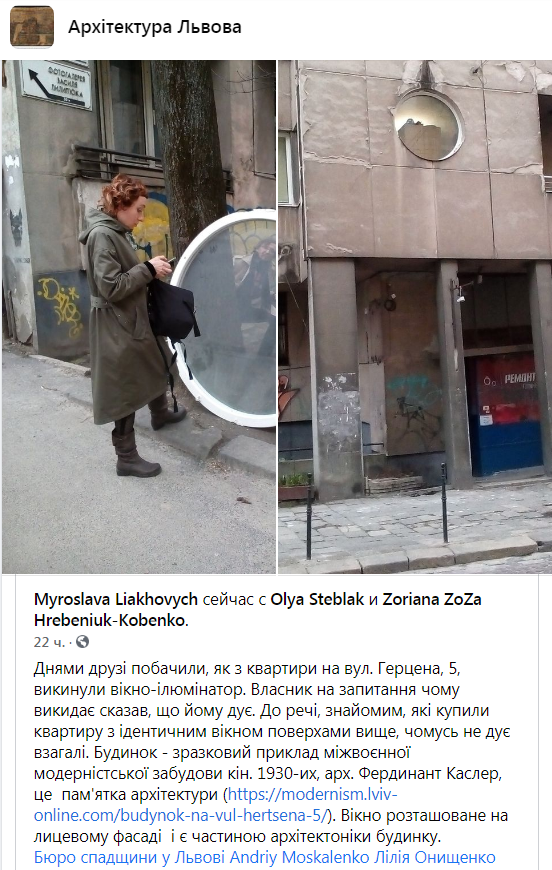 «Днями друзі побачили, як з квартири на вул. Герцена, 5, викинули вікно-ілюмінатор. Власник на запитання чому викидає сказав, що йому дує. До речі, знайомим, які купили квартиру з ідентичним вікном поверхами вище, чомусь не дує взагалі. Будинок – зразковий приклад міжвоєнної модерністської забудови кін. 1930-их, арх. Фердинант Каслер, це пам’ятка архітектури (https://modernism.lviv-online.com/budynok-na-vul-hertsena-5/). Вікно розташоване на лицевому фасаді і є частиною архітектоніки будинку», – зазначає у повідомленні Myroslava Liakhovych.