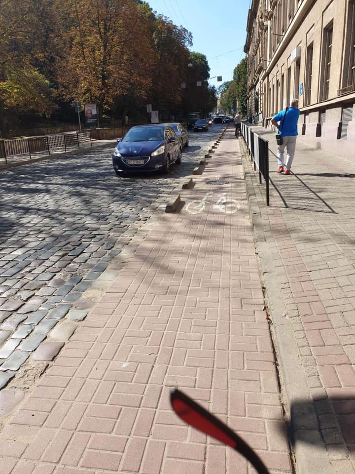 Шматки неправильної форми, осколки, різноколірного сміття. Тобто вибраковані залишки різних видів і ґатунків бруківки з різних вулиць Львова. Які зараз заасфальтовані. Ціла – тобто якісна бруківка зникла з наших вулиць – за те активно появляється в містах Європи, які дбають за своє історичне обличчя. А ще гляньте на ось ту позорну так звану «велодоріжку» яка розпочинається ніг де і так само раптово закінчується нігде….. тобто ця поломка довжиною 300 метрів зроблена виключно для того, щоб забрати (вкрасти) історичну бруківку і закупити «Катеринки» штучну бруківку з заводу Катерини Заєць – дружини мера Садового. Тобто нас з вами обікрали кілька разів!