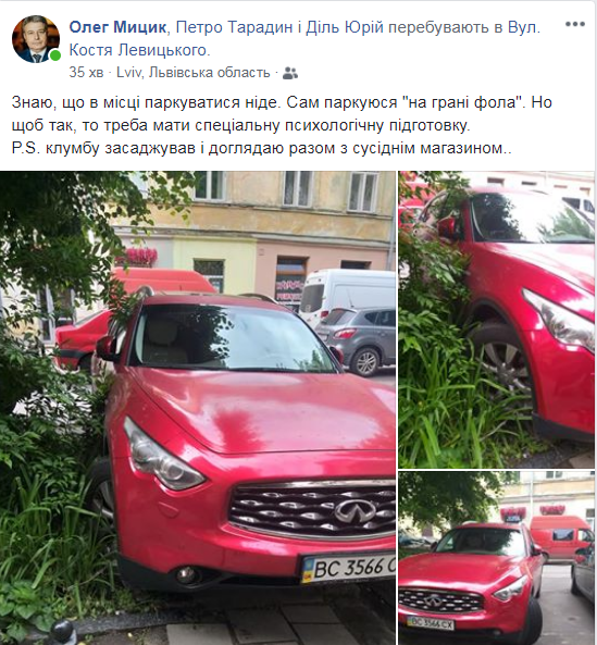 “Знаю, що в місці паркуватися ніде. Сам паркуюся “на грані фола”. Но щоб так, то треба мати спеціальну психологічну підготовку. Клумбу засаджував і доглядаю разом з сусіднім магазином”, – зазначив у коментарі до світлин Олег Мицик.