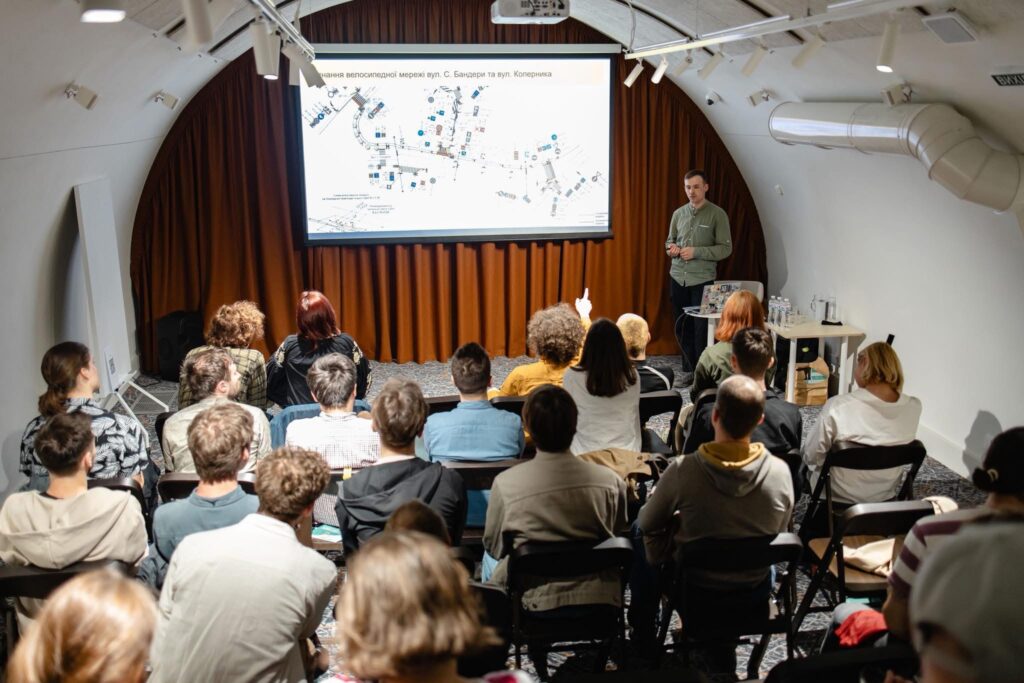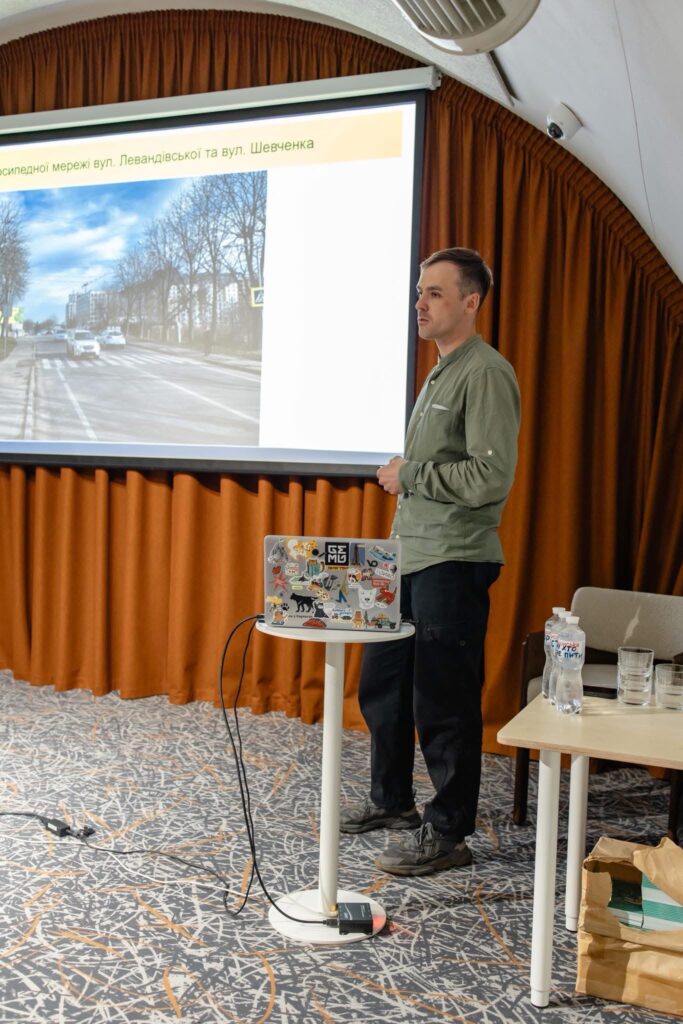 Учасники ознайомилися з планами міста, які представив Орест Олеськів — заступник директора департаменту міської мобільності та вуличної інфраструктури ЛМР з питань розвитку велосипедної інфраструктури.