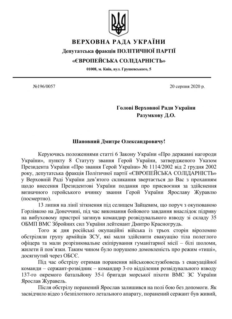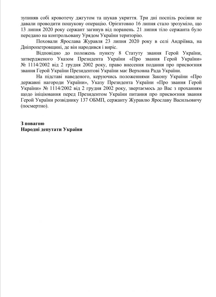 «Звертаємось до вас із проханням щодо ініціювання перед Президентом України питання про присвоєння звання Герой України розвіднику 137 ОБМП, сержанту Журавлю Ярославу Васильовичу (посмертно)», – йдеться у зверненні до Голови Верховної Ради.