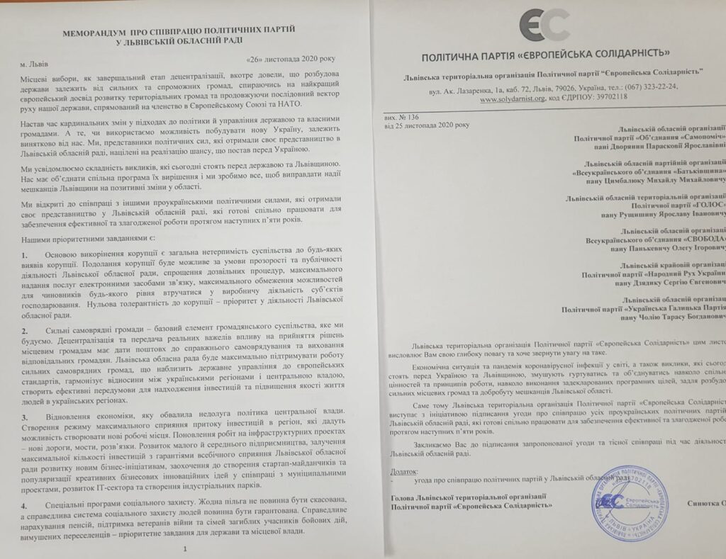 Європейська Солідарність запропонувала “Самопомочі”, “Свободі”, “Голосу”, “Батьківщині”, “Народному Рухові України”, “Українській Галицькій Партії” створити більшість у Львівській обласній раді.