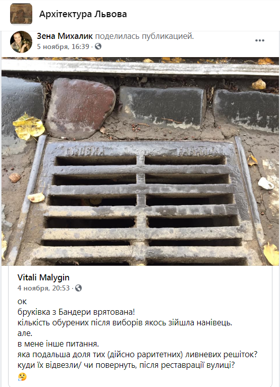 «Бруківка з Бандери врятована. В мене інше питання. Яка подальша доля тих (дійсно раритетних) ливневих решіток? Куди їх відвезли і чи повернуть після реставрації вулиці?», – зазначив у дописі на своїй сторінці у ФБ Vitali Malygin.
