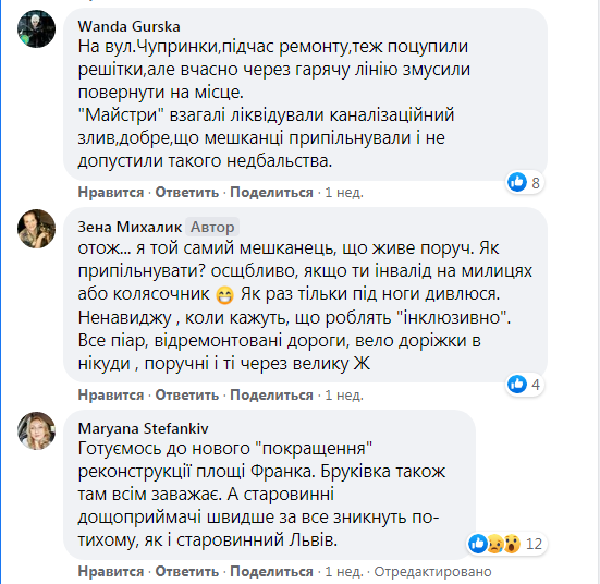 У коментарях до допису городяни, зокрема зазначають, що після ремонту вулиці Генерала Чупринки зникли старовинні ливневі решітки і їх повернули на місце “після звернень на “Гарячу лінію міста Львова”.