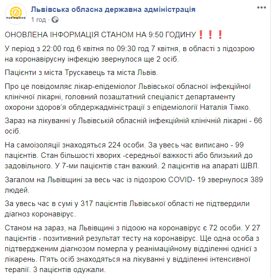 У період з 22:00 год 5 квітня по 09:30 год 6 квітня, в області з підозрою на коронавірусну інфекцію звернулося ще 2 осіб. Пацієнти з міста Трускавець та міста Львів.