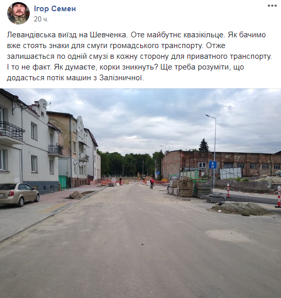 “Левандівська, виїзд на Шевченка. Оте майбутнє квазі-кільце. Як бачимо, вже стоять знаки для смуги громадського транспорту. Отже залишається по одній смузі в кожну сторону для приватного транспорту. І то не факт. Як думаєте, корки зникнуть? Ще треба розуміти, що додасться потік машин з Залізничної”,- зазначається у коментарі до світлини з місця події.