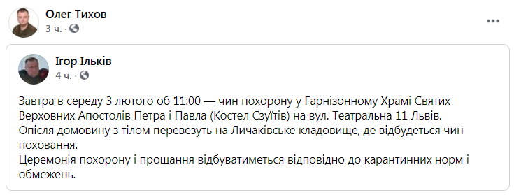 Завтра в середу 3 лютого об 11:00 — чин похорону у Гарнізонному Храмі Святих Верховних Апостолів Петра і Павла (Костел Єзуїтів) на вул. Театральній, 11 у Львові.