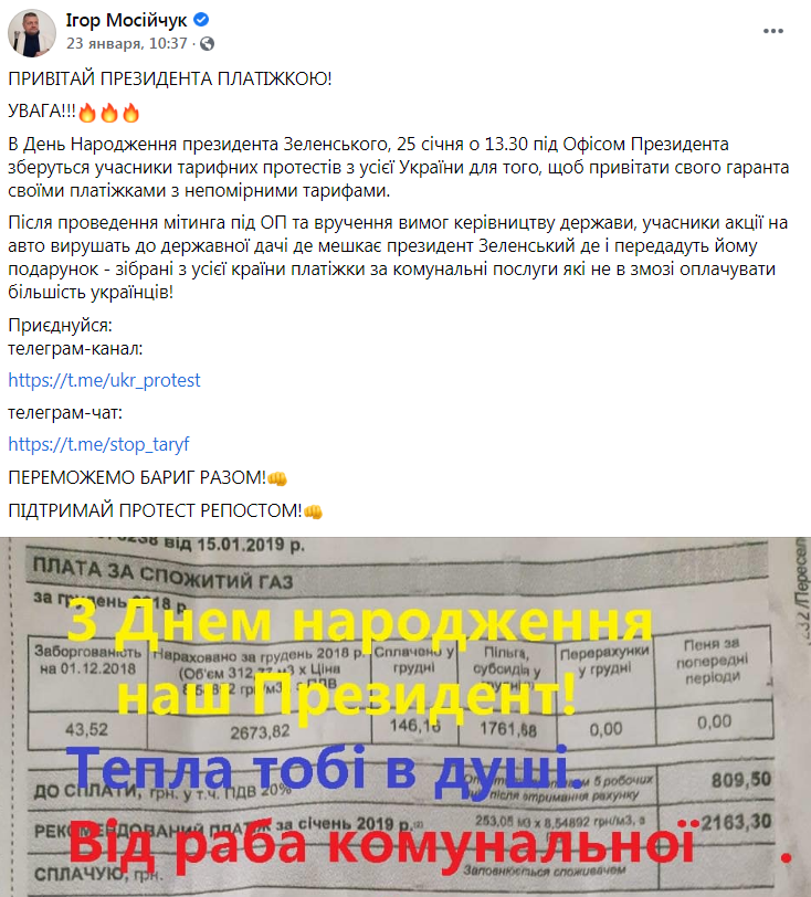 В День Народження президента Зеленського, 25 січня о 13.30 під Офісом Президента зберуться учасники тарифних протестів з усієї України для того, щоб привітати свого гаранта своїми платіжками з непомірними тарифами.