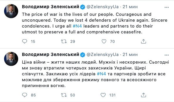«Сьогодні на Донбасі загинуло четверо українських військовослужбовців. Я висловлюю щирі співчуття родинам і близьким загиблих.