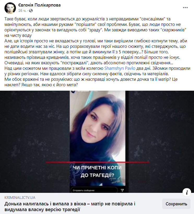 «Гвалтували у підвалі та в гаражі, а потім викинули з 5 поверху. Рівнянка, яка дивом вижила після падіння, звинувачує львівських поліцейських у страшному злочині! Каже, трагедія сталася у місті Стрий, а її матір, називає навіть прізвища копів, які познущалися над дочкою. Тільки уявіть: жінка запевняє, що серед нелюдів був керівник місцевого карного розшуку. Ба більше: вказує на свідків, які можуть підтвердити її слова. Наші журналісти (Євгенія Полікарпова та Павло Шамшин) поспілкувалася з цими очевидцями та провели власне розслідування. Нововиявлені факти, вас обов’язково вразять»,- зазначається у коментарі до сюжету «Надзвичайних новин».