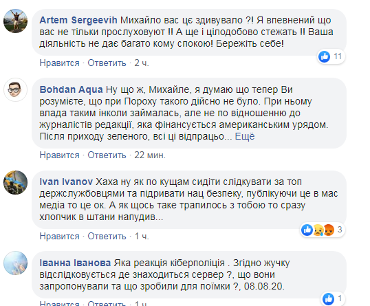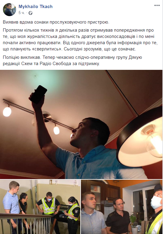 «Виявив вдома ознаки прослуховуючого пристрою. Протягом кількох тижнів я декілька разів отримував попередження про те, що моя журналістська діяльність дратує високопосадовців і по мені почали активно працювати. Від одного джерела була інформація про те, що планують «сверлитись». Сьогодні зрозумів, що це означає. Поліцію викликав. Тепер чекаємо слідчо-оперативну групу Дякую редакції Схем та Радіо Свобода за підтримку», – написав Ткач.