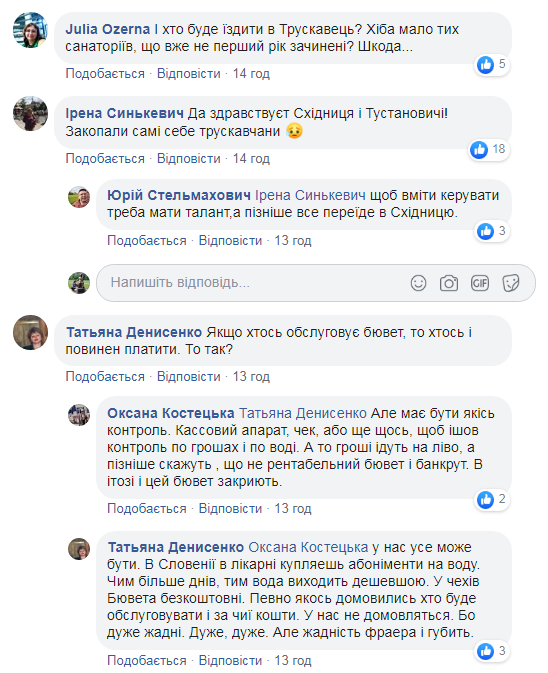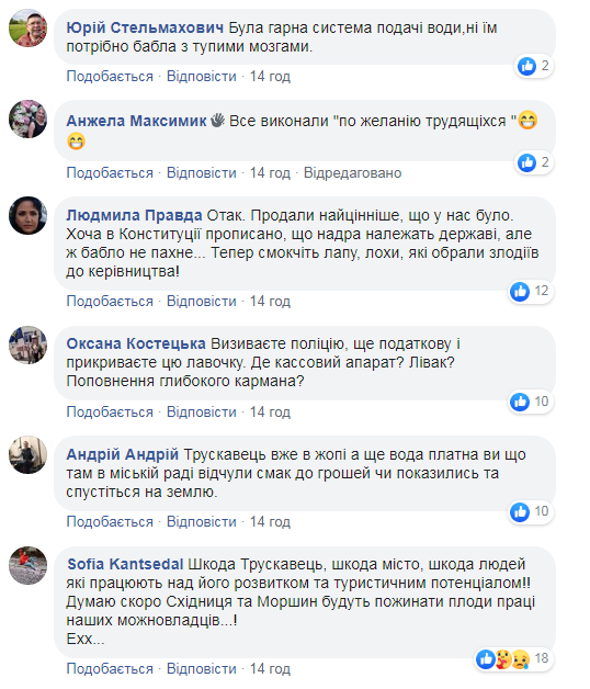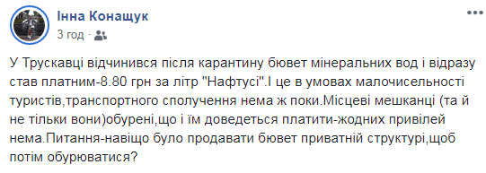 “У Трускавці відчинився після карантину бювет мінеральних вод і відразу став платним-8.80 грн за літр “Нафтусі”. І це в умовах малочисельності туристів,транспортного сполучення нема ж поки. Місцеві мешканці (та й не тільки вони)обурені,що і їм доведеться платити-жодних привілей нема. Питання-навіщо було продавати бювет приватній структурі,щоб потім обурюватися?”, – зазначила у своєму дописі Інна Конащук.