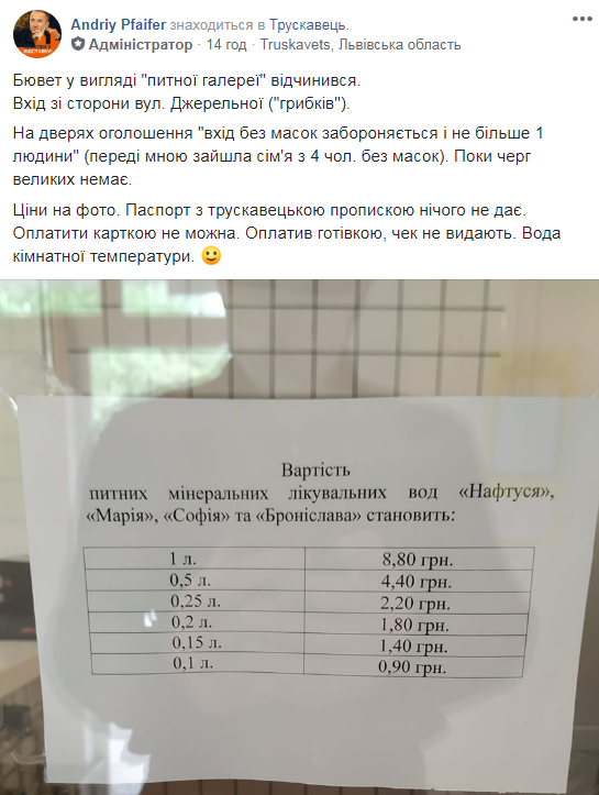 “Бювет у вигляді “питної галереї” відчинився. Вхід зі сторони вул. Джерельної (“грибків”). На дверях оголошення “вхід без масок забороняється і не більше 1 людини” (переді мною зайшла сім’я з 4 чол. без масок). Поки черг великих немає. Ціни на фото. Паспорт з трускавецькою пропискою нічого не дає. Оплатити карткою не можна. Оплатив готівкою, чек не видають. Вода кімнатної температури”, – зазначає у дописі Andriy Pfaifer на сторінці спільноти Трускавець News.