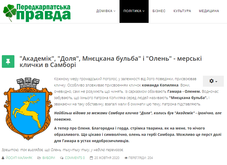 “Академік”, “Доля”, Мнєцкана бульба” і “Олень” – мерські клички в Самборі, – журналіст