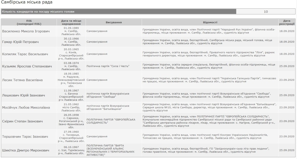 Як пише сайт «Варіанти», на посаду міського голови Самбора претендують 10 осіб. Центральна виборча комісія оприлюднила перелік кандидатів, які претендують на посаду міського голови Самбора.