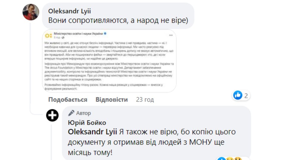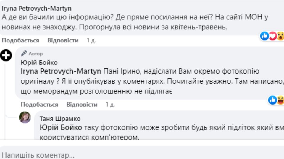 «Батьки, які віддають дітей до школи чи садочка не повинні бути в курсі того, які ідеї просуває Міністерство освіти України в голови дітей! Копію меморандуму я отримав не з інтернет-джерел, а від представника МОН з Києва, який категорично був проти підписання такого роду документа. Згаданий представник дозволив мені опублікувати текст меморандуму», – заявив Юрій Бойко вже у наступному своєму пості у Facebook.