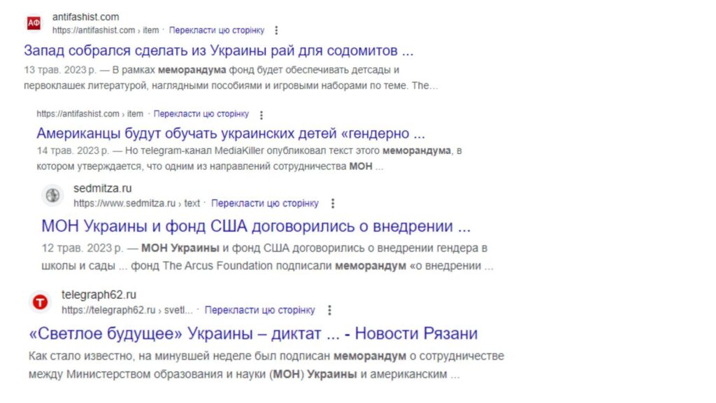 Згодом повідомлення про нібито співпрацю МОН та The Arcus Foundation почали поширювати пропагандистські російські ЗМІ, які використали фейковий меморандум для просування антизахідних наративів.