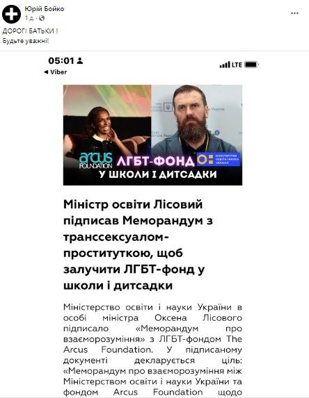 У своєму дописі на Facebook Юрій Бойко переконує, що копію документа йому передав працівник міністерства, його прізвища священик не розголошує. Юрій Бойко поширює скріншот публікації із сайту «Всі разом» із заголовком «Міністр освіти Лісовий підписав Меморандум з транссексуалом-проституткою, щоб залучити ЛГБТ-фонд у школи і дитсадки».