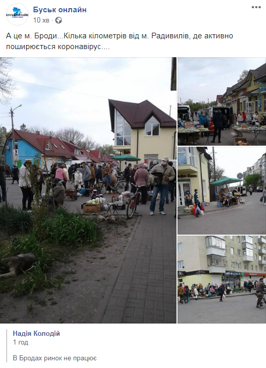 “А це м. Броди… Кілька кілометрів від м. Радивилів, де активно поширюється коронавірус….”, – зазначила у дописі під світлинами Надія Колодій.