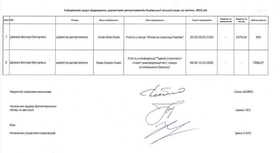 У березні-квітні цього року у двох службових відрядженнях побувала директорка департаменту фінансової політики Львівської міськради Вікторія Довжик, видатки на які склали 9 585,51 грн.