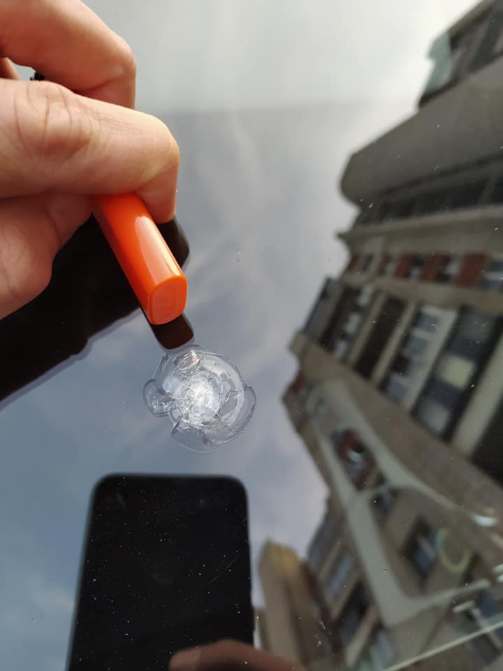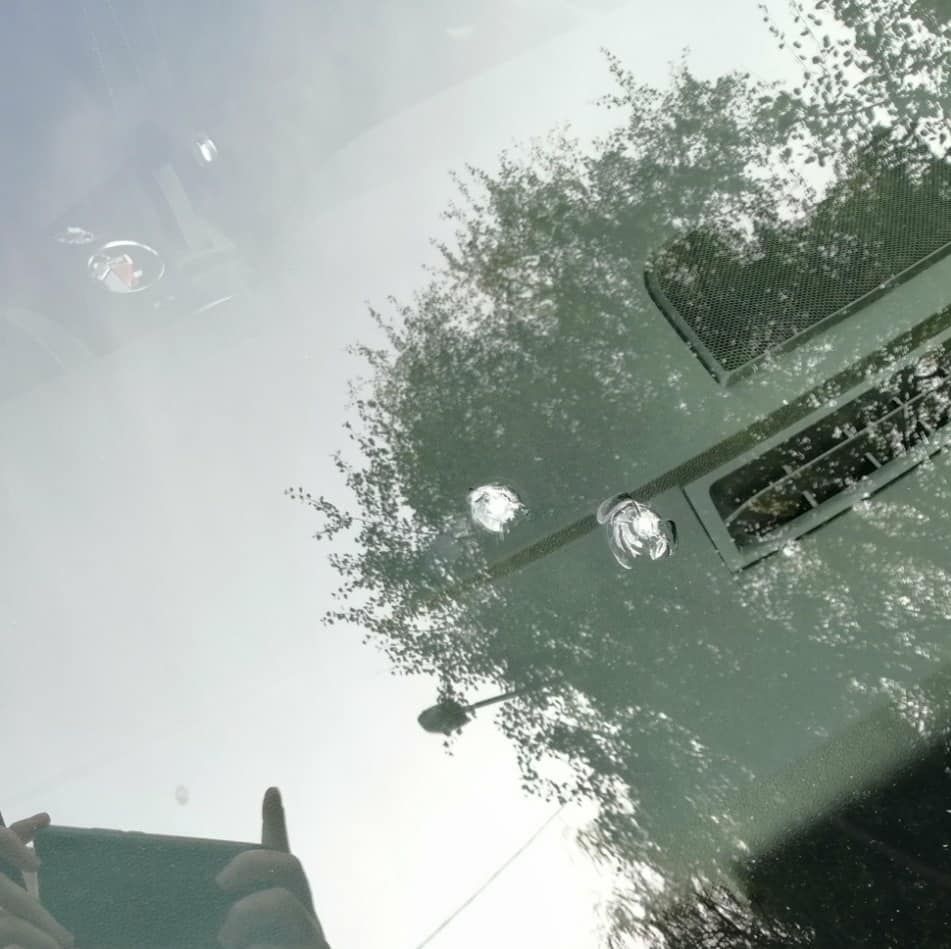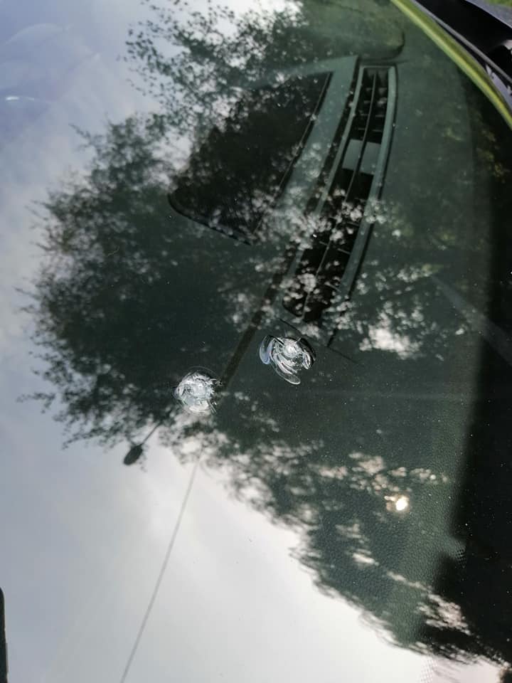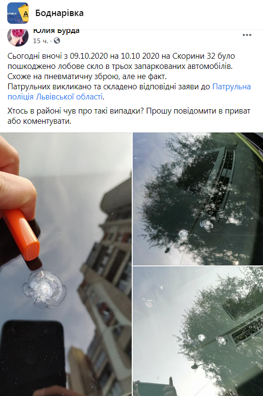 «Вночі з 09.10.2020 на 10.10 2020, на Скорини, 32 було пошкоджено лобове скло в трьох запаркованих автомобілів. Схоже на пневматичну зброю, але не факт. Патрульних викликано та складено відповідні заяви», – зазначається у дописі Юлії Бурди, яка оприлюднила світлини з місця події.
