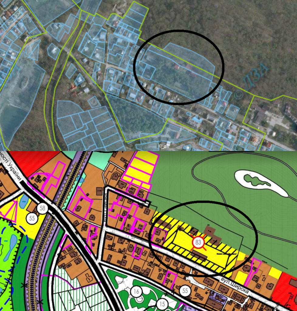 - Зверху – ділянки на Публічній кадастровій карті. Знизу на генплані селища