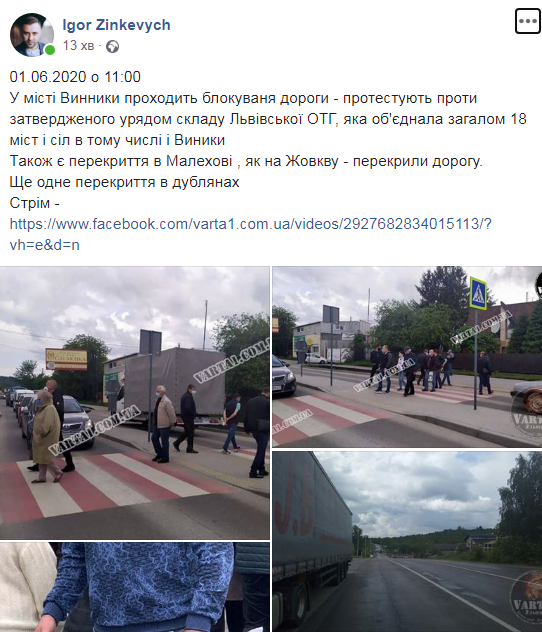 1 червня з 11:00 у місті Винники проходить блокування дороги – протестують проти затвердженого урядом складу Львівської ОТГ, яка об’єднала загалом 18 міст і сіл в тому числі і Виники.
