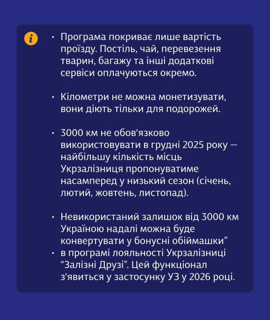 6. 3000 км не обов’язково використовувати в грудні 2025 року — найбільшу кількість місць Укрзалізниця пропонуватиме насамперед у низький сезон (січень, лютий, жовтень, листопад).