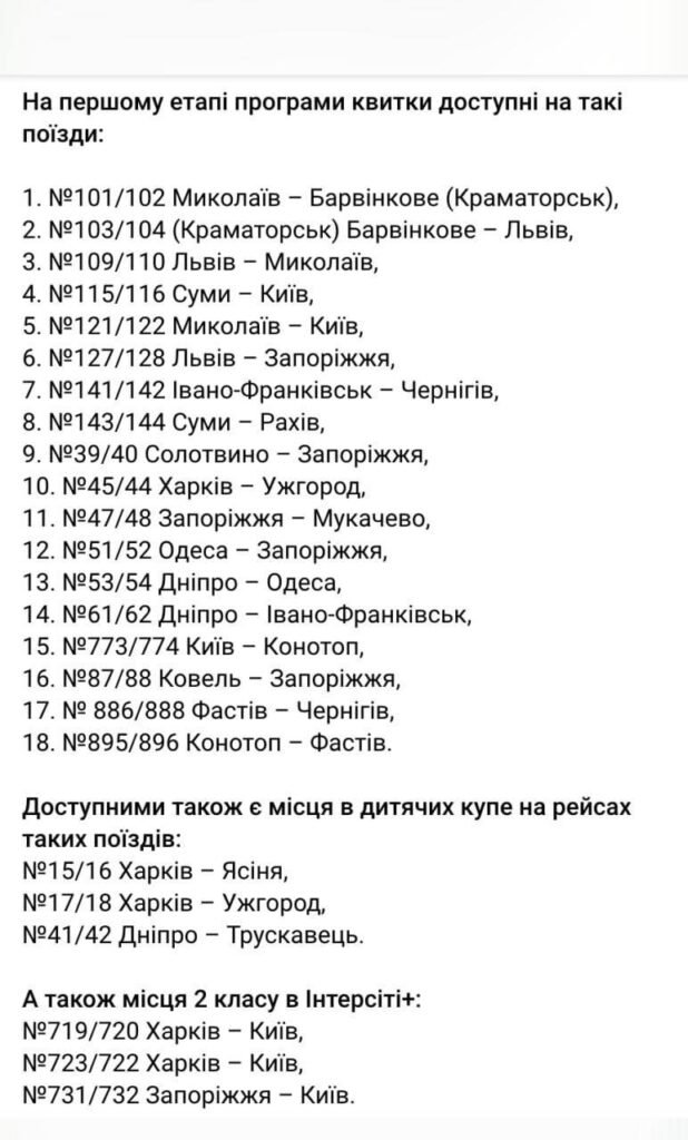 Доступними також є місця в дитячих купе на рейсах таких поїздів: