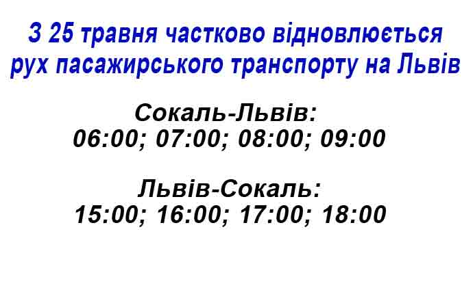 Як зазначається, зі Сокаля до Львова та у зворотньому напрямку з 25 травня курсуватимуть автобуси для перевезення пасажирів (4 рейси).