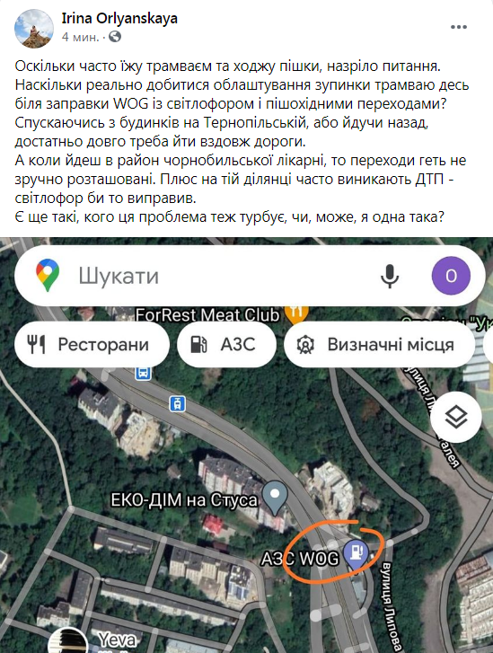 «Оскільки часто їжджу трамваєм та ходжу пішки, назріло питання. Наскільки реально добитися облаштування зупинки трамваю десь біля заправки WOG із світлофором і пішохідними переходами? Спускаючись з будинків на Тернопільській, або йдучи назад, достатньо довго треба йти вздовж дороги. А коли йдеш в район чорнобильської лікарні, то переходи геть не зручно розташовані. Плюс на тій ділянці часто виникають ДТП – світлофор би то виправив. Є ще такі, кого ця проблема теж турбує, чи, може, я одна така?», – зазначається у дописі Irina Orlyanskaya на сторінці спільноти «Новий Львів» у ФБ