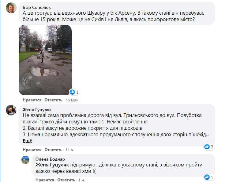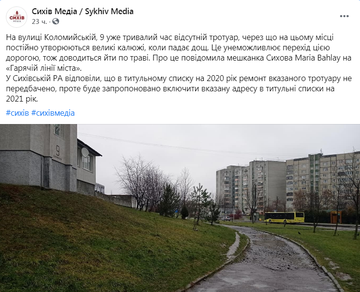 «У Сихівській РА відповіли, що в титульному списку на 2020 рік ремонт вказаного тротуару не передбачено, проте буде запропоновано включити вказану адресу в титульні списки на 2021 рік»,- зазначає «Сихів Медіа».