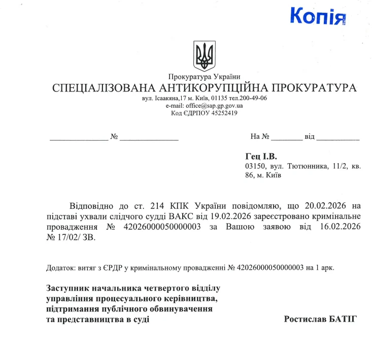 Раніше Вищий антикорупційний суд України ухвалою від 19 лютого 2026 року у справі № 991/1480/26 зобов’язав керівника Спеціалізованої антикорупційної прокуратури Олександра Клименка внести відомості до Єдиного реєстру досудових розслідувань і розпочати кримінальне провадження щодо директора ЛКП «Зелене місто» Олександра Єгорова. Досудове розслідування має здійснювати Національне антикорупційне бюро України.