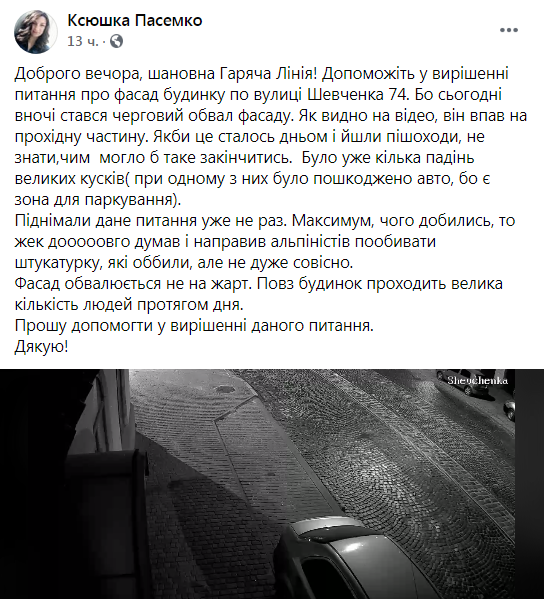 «Допоможіть у вирішенні питання про фасад будинку по вулиці Шевченка, 74. Бо сьогодні вночі стався черговий обвал фасаду. Як видно на відео, він впав на прохідну частину. Якби це сталось вдень і йшли пішоходи, не знати,чим могло б таке закінчитись. Було уже кілька падінь великих кусків (при одному з них було пошкоджено авто, бо є зона для паркування). Піднімали дане питання уже не раз. Максимум чого добились, то ЖЕК довго думав і направив альпіністів позбивати штукатурку, які оббили, але не дуже совісно. Фасад обвалюється не на жарт. Повз будинок проходить велика кількість людей протягом дня»,- зазначає у зверненні на «Гарячу лінію міста Львова» Ксюшка Пасемко, яка оприлюднила відео та світлини з місця події.