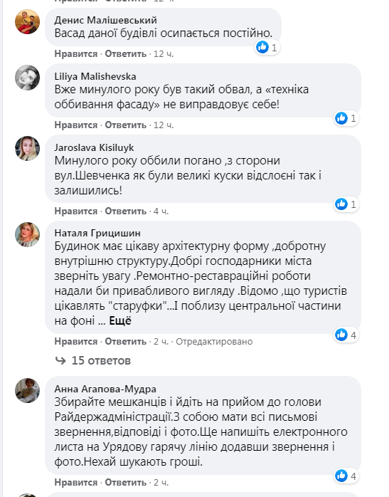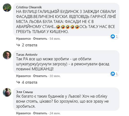 Як зазначається у тексті звернення, падіння штукатурки з фасаду будинку № 74 сталося вже не вперше, навіть було пошкодження припаркованого автомобіля, однак комунальники проблему не усувають. Натомість, направили альпіністів «збити штукатурку».